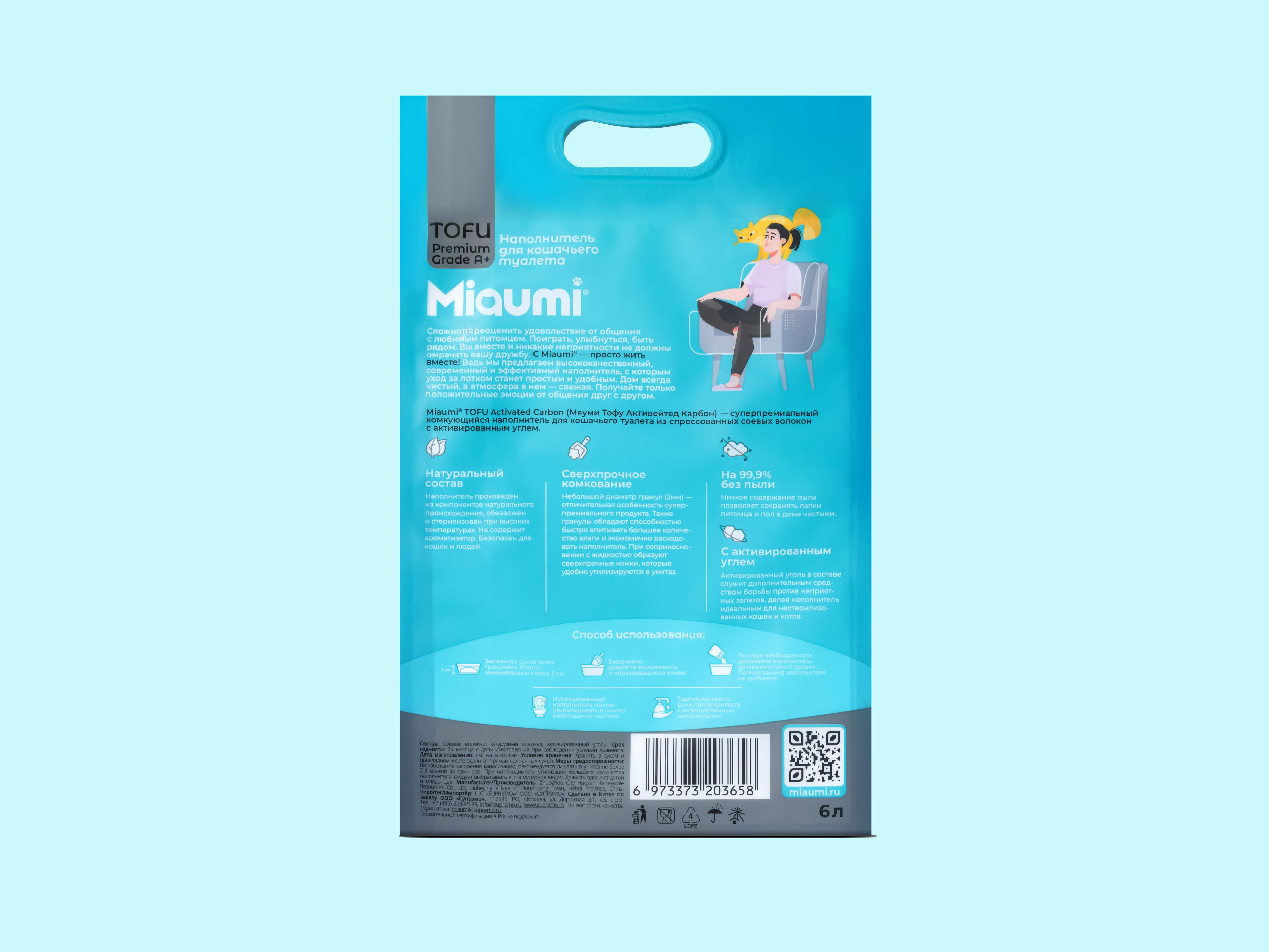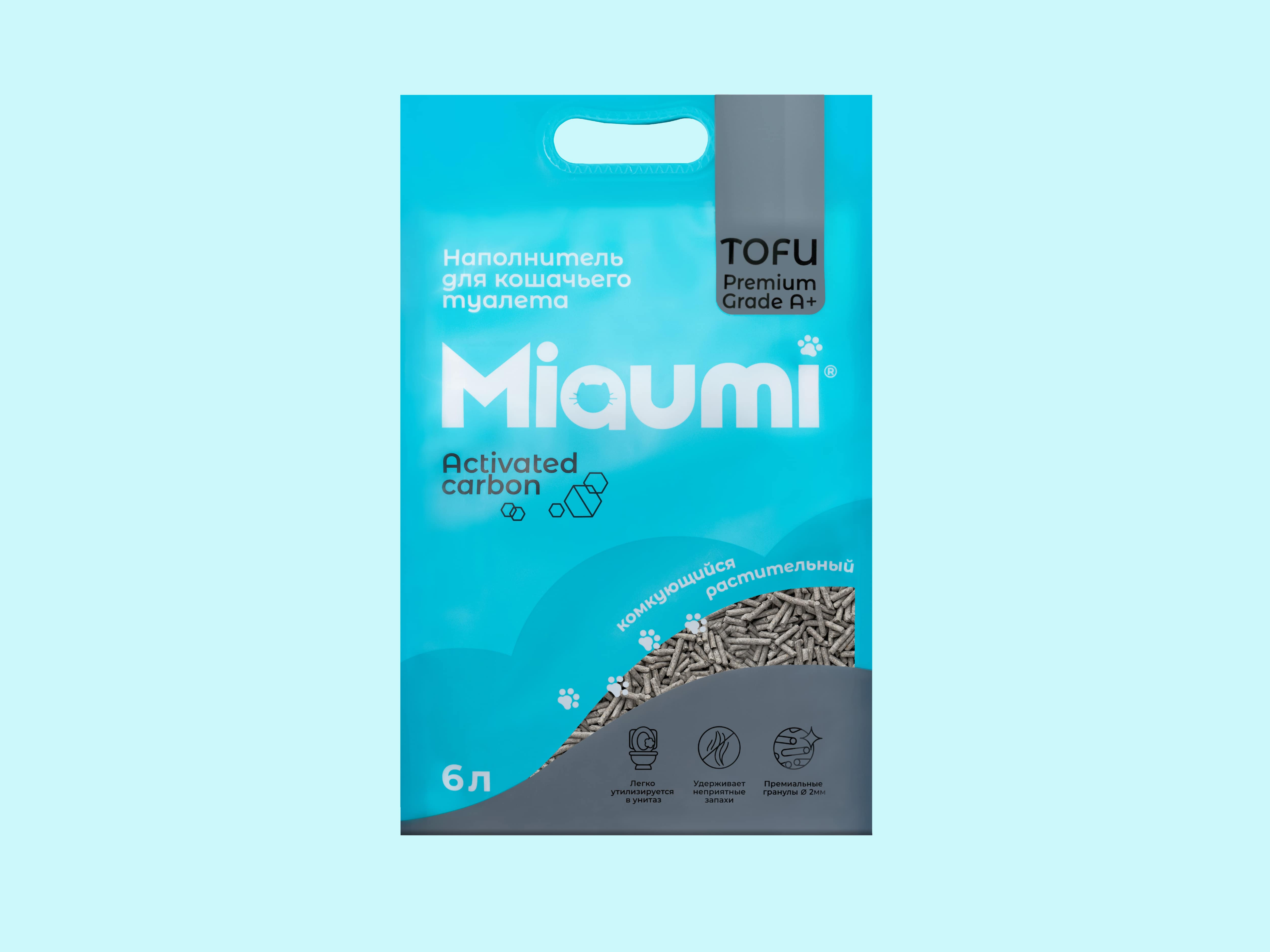 Miaumi® TOFU Activated Carbon Unscented – натуральный наполнитель для кошачьего туалета из спрессованных соевых волокон с активированным углем.