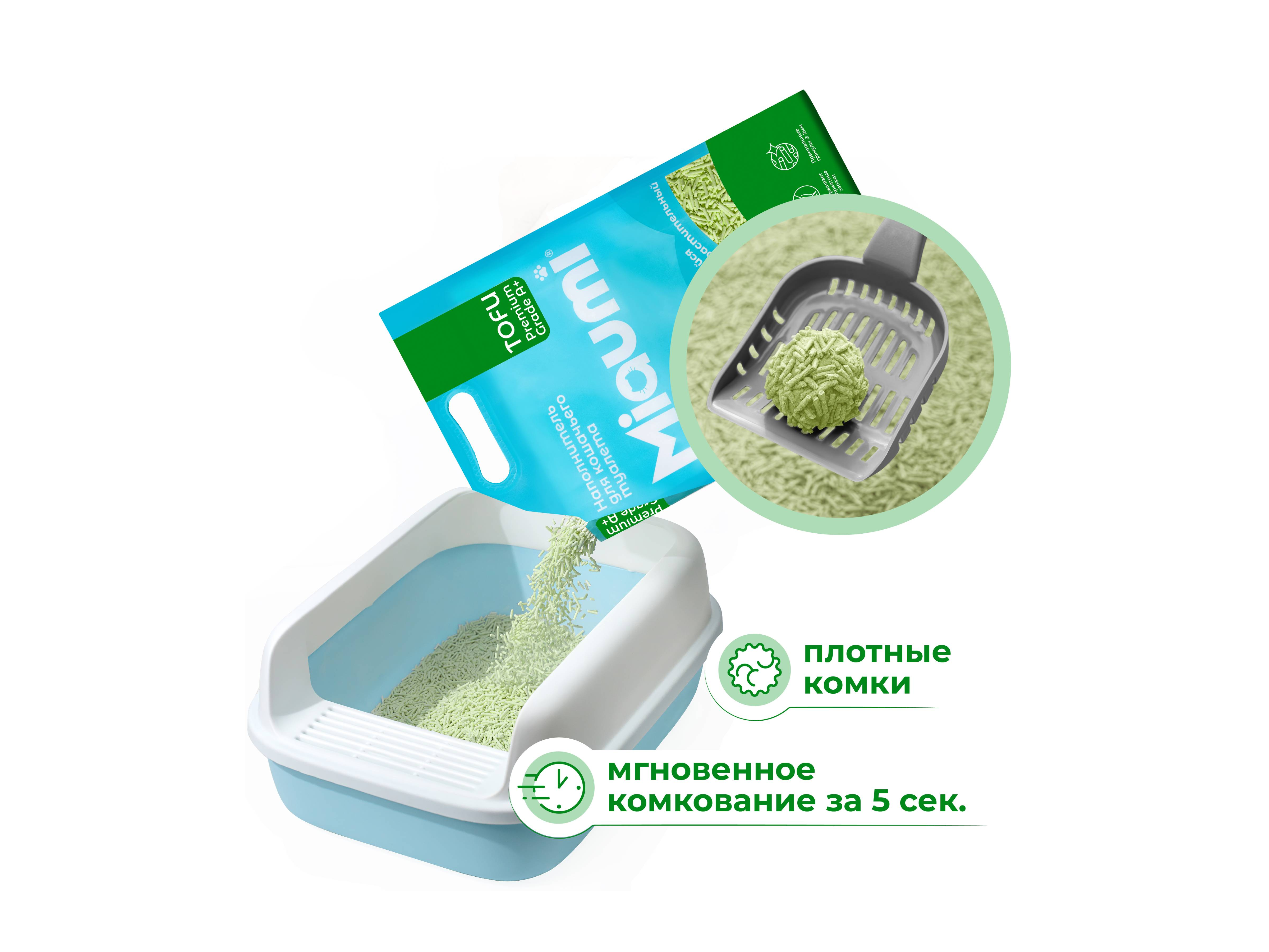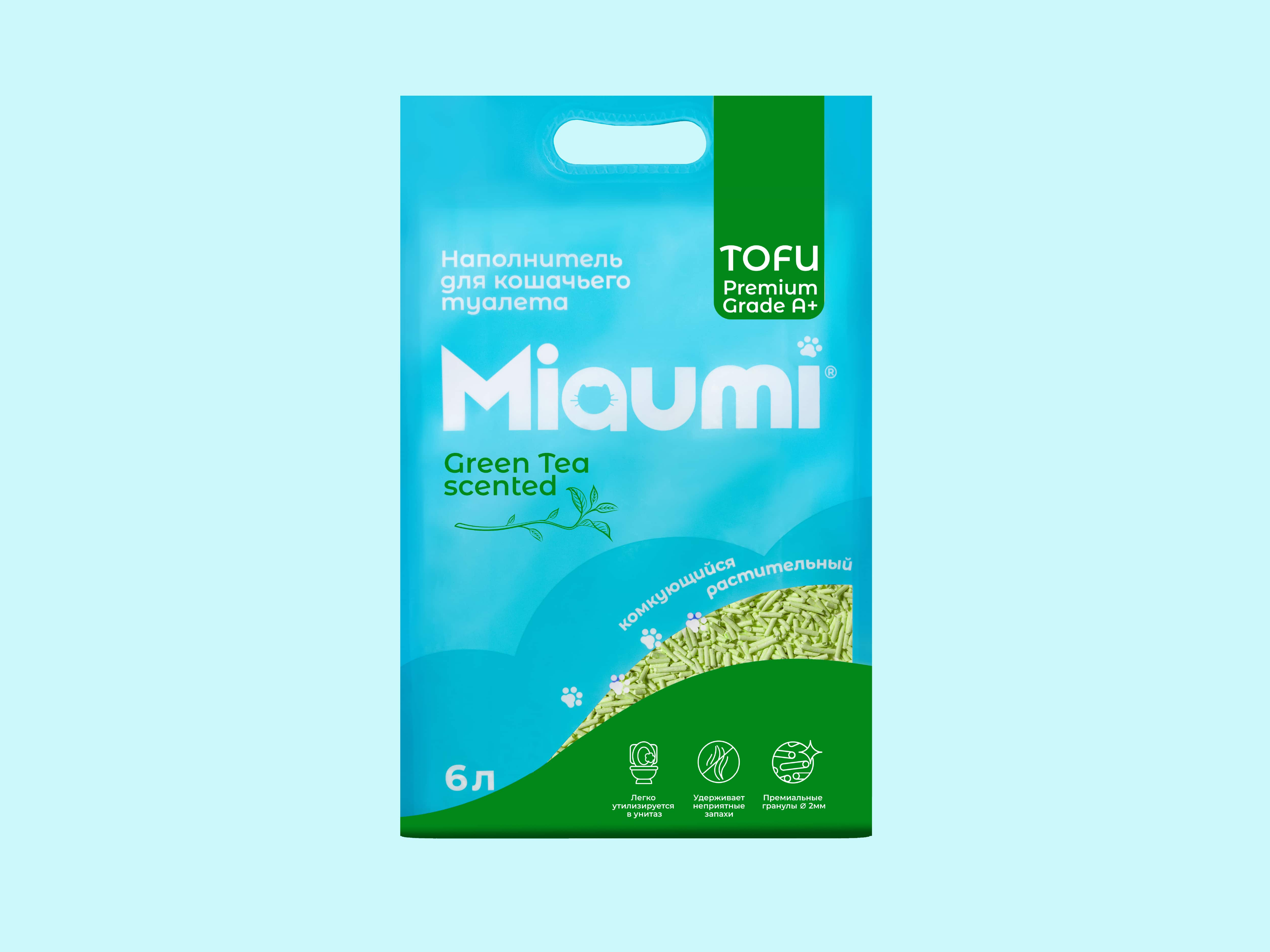 Miaumi® TOFU Green Tea Scented – натуральный наполнитель для кошачьего туалета из спрессованных соевых волокон с нежным ароматом зеленого чая.