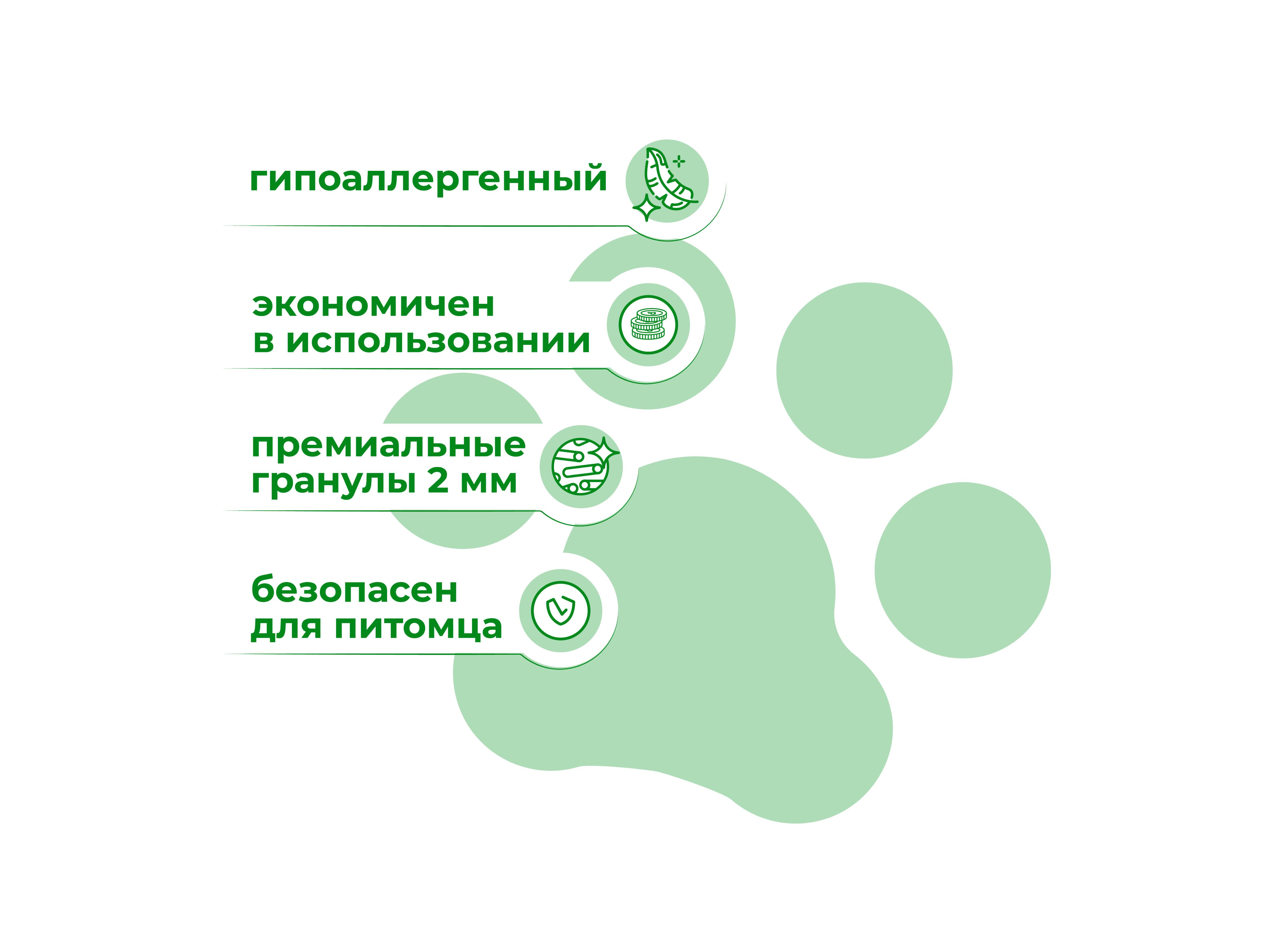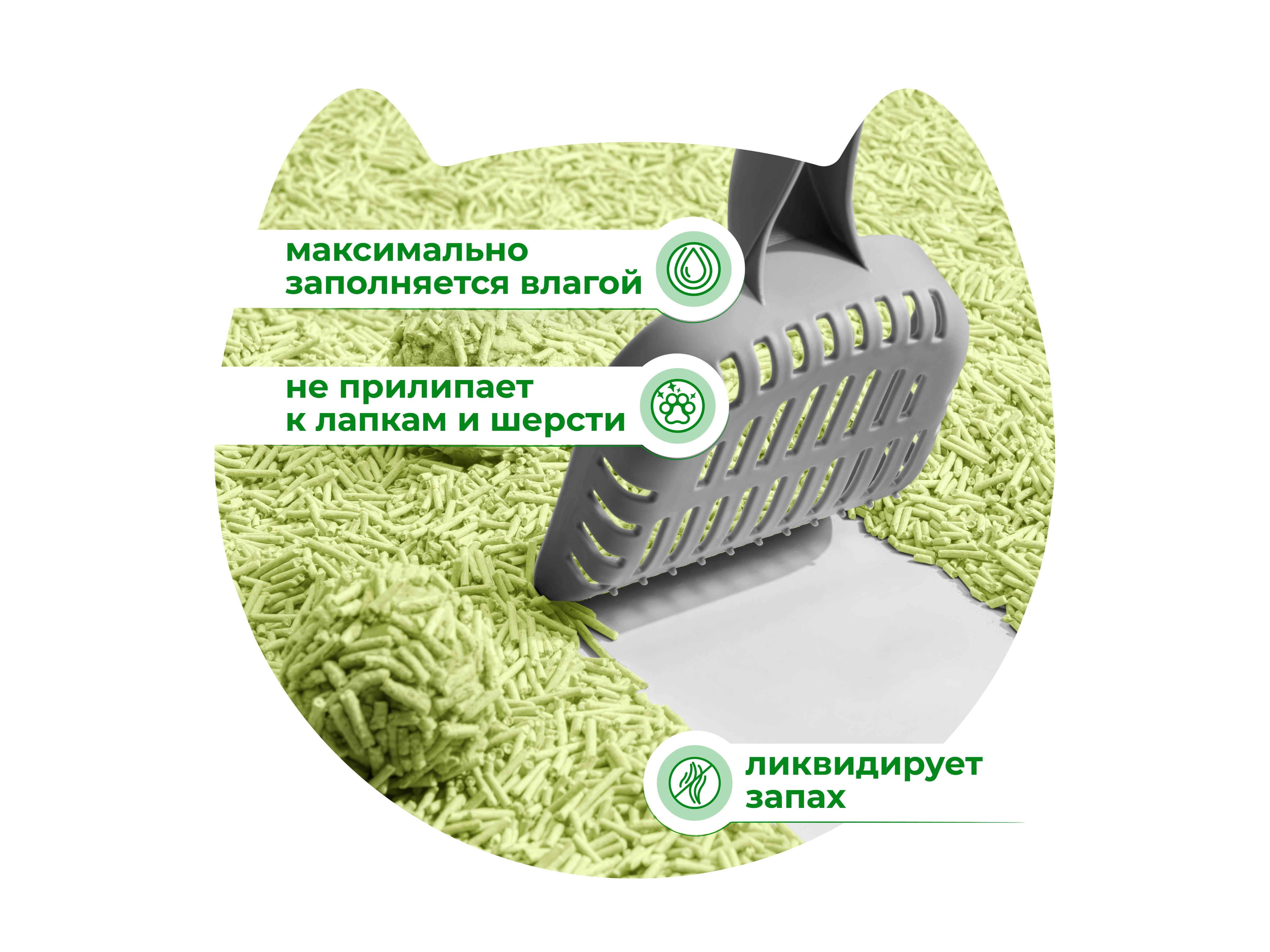 Высокая абсорбирующая способность гранул позволяет надежно блокировать неприятные запахи и сохранять лоток чистым, а компоненты натурального происхождения делают его безопасным для кошек и людей.