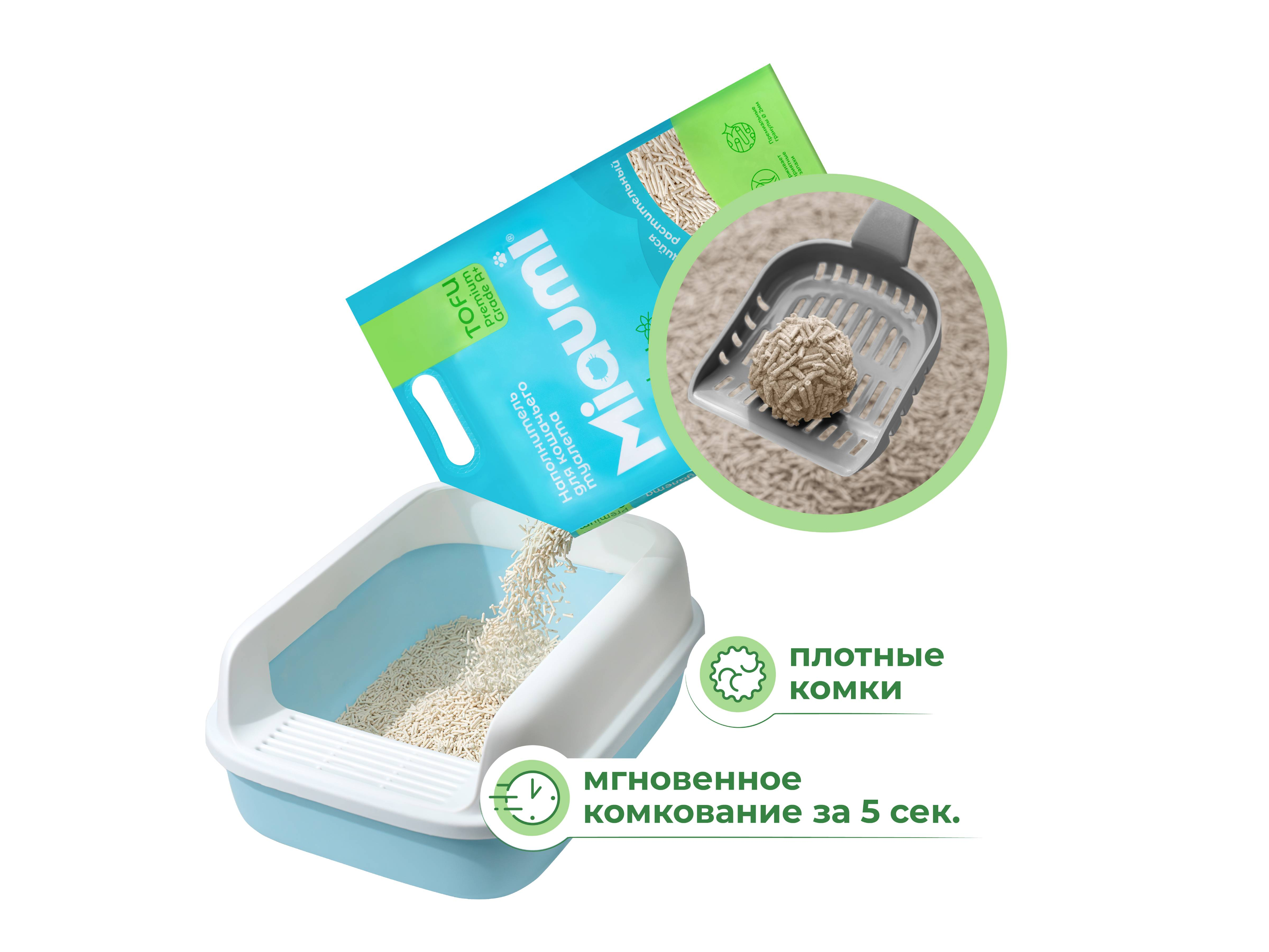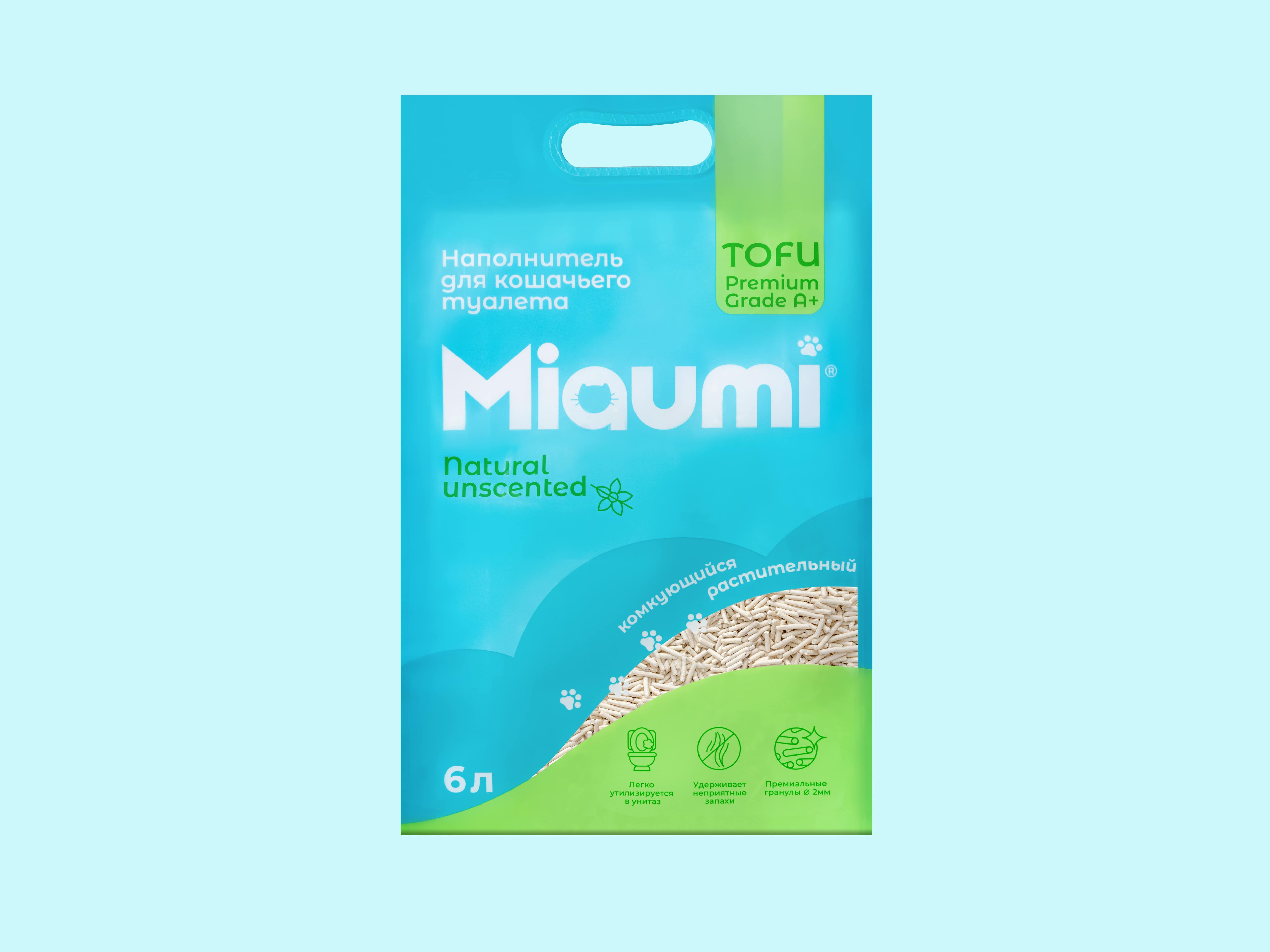 Особенностью наполнителя Miaumi® TOFU Natural Unscented являются премиальные гранулы диаметром 2 мм, обладающие способностью образовывать сверхпрочные комки при соприкосновении с жидкостью, которые впоследствии легко утилизируются в унитаз.