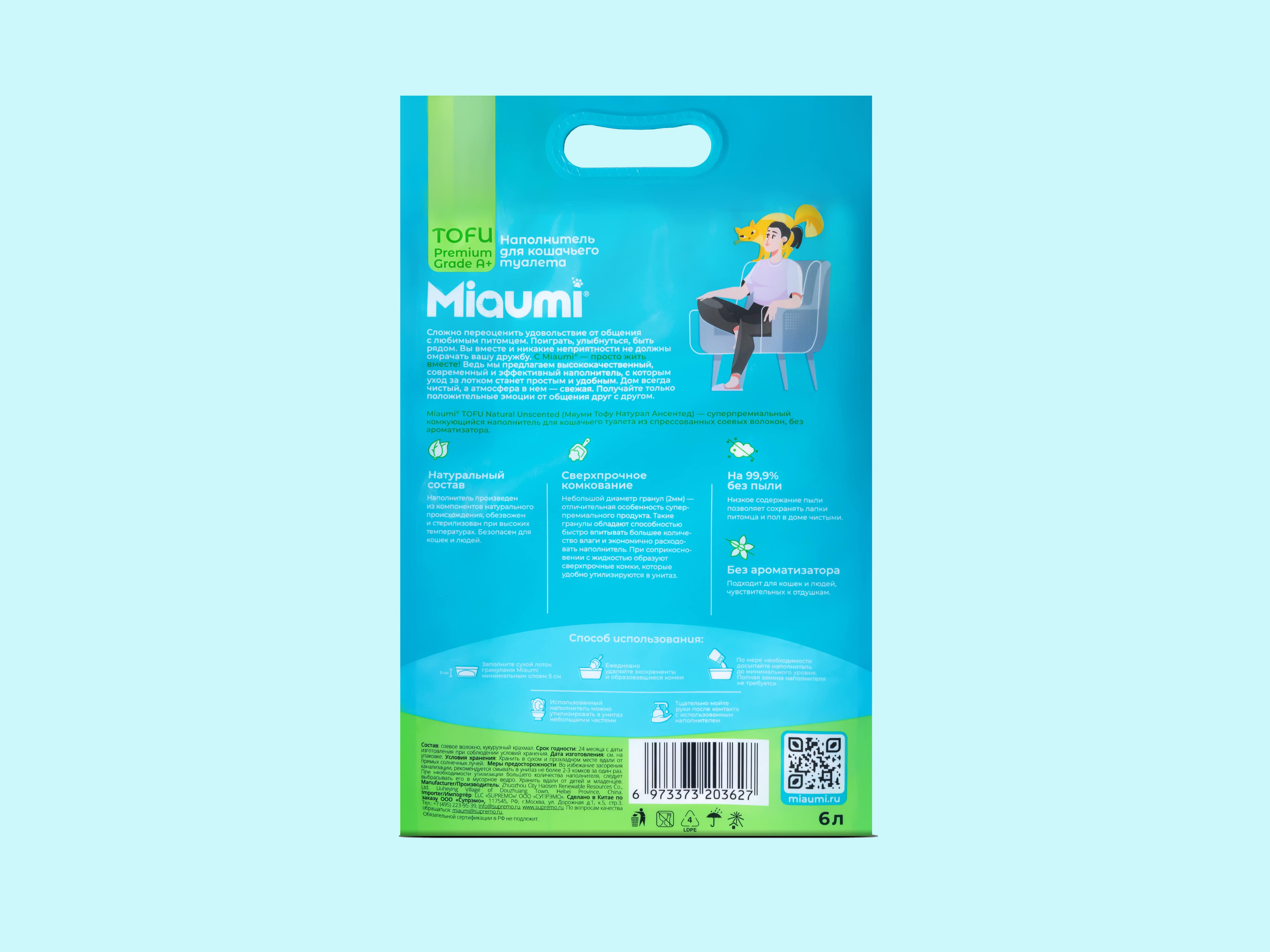 С Miaumi® TOFU Natural Unscented будет легко поддерживать чистоту и уют в доме, ведь наполнитель обеспылен на 99,9%, что позволит сохранять лапки питомца чистыми, как и пол в доме.