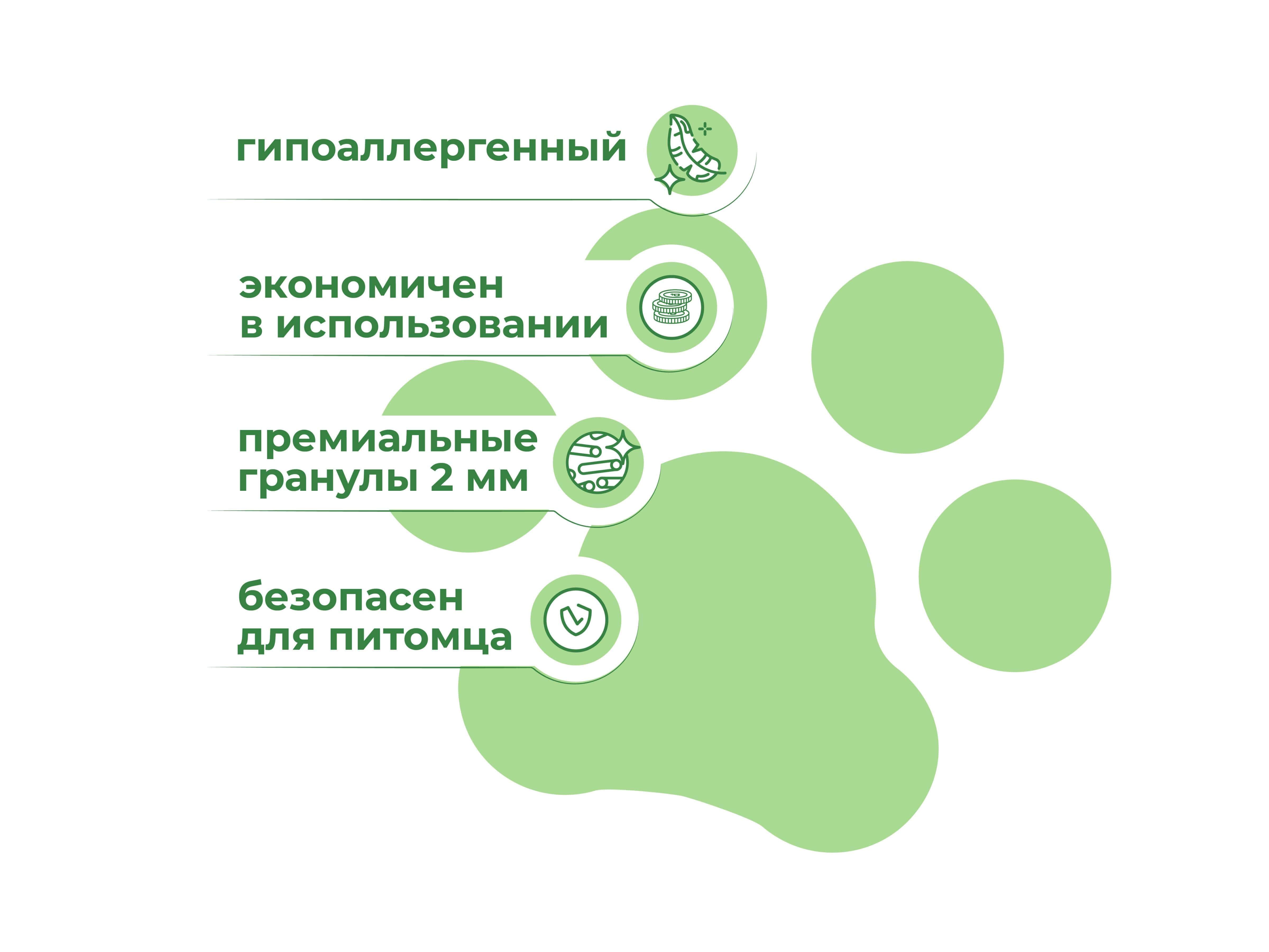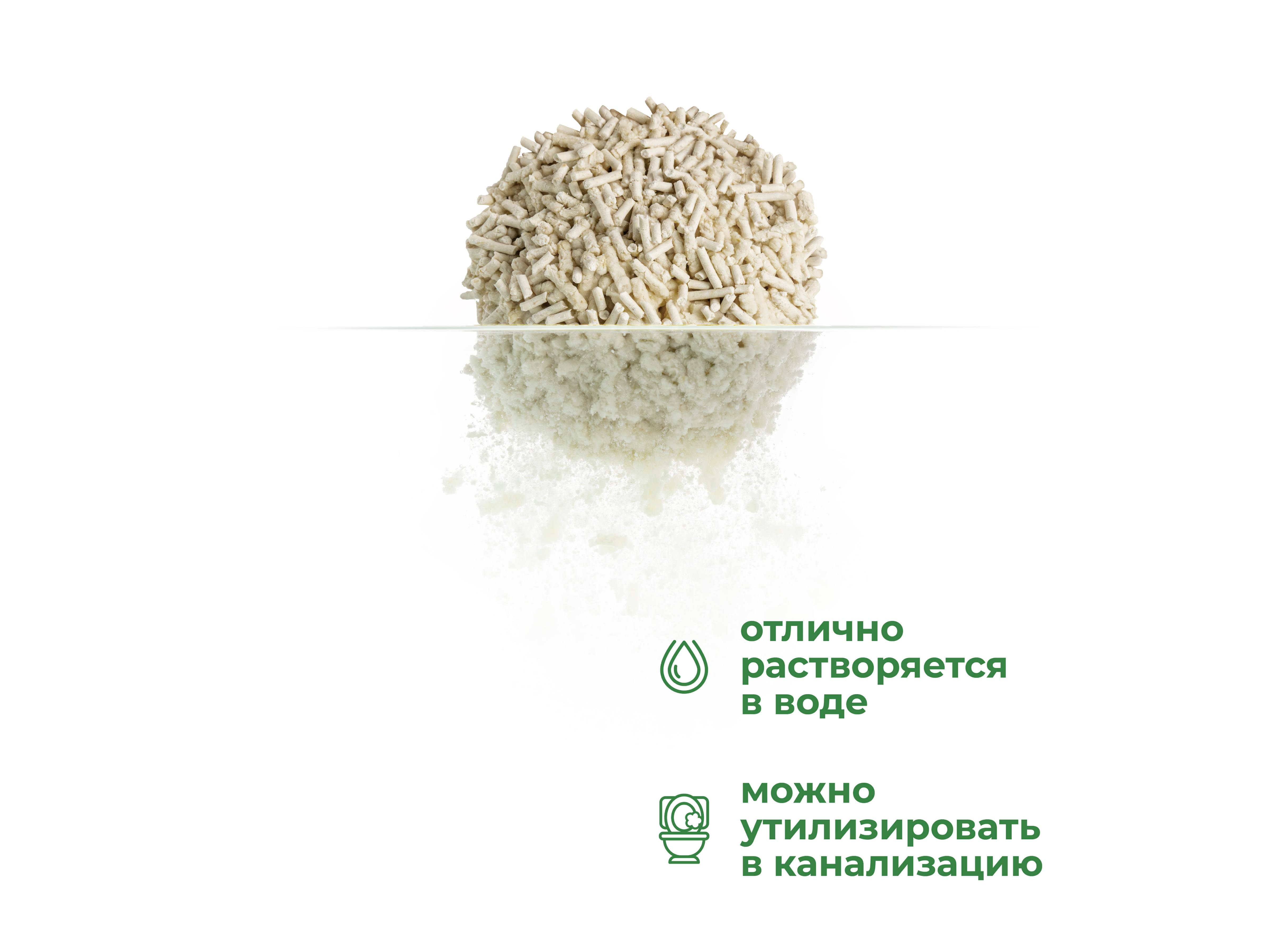 Высокая абсорбирующая способность гранул позволяет надежно блокировать неприятные запахи и сохранять лоток чистым, а компоненты натурального происхождения делают его безопасным для кошек и людей.
