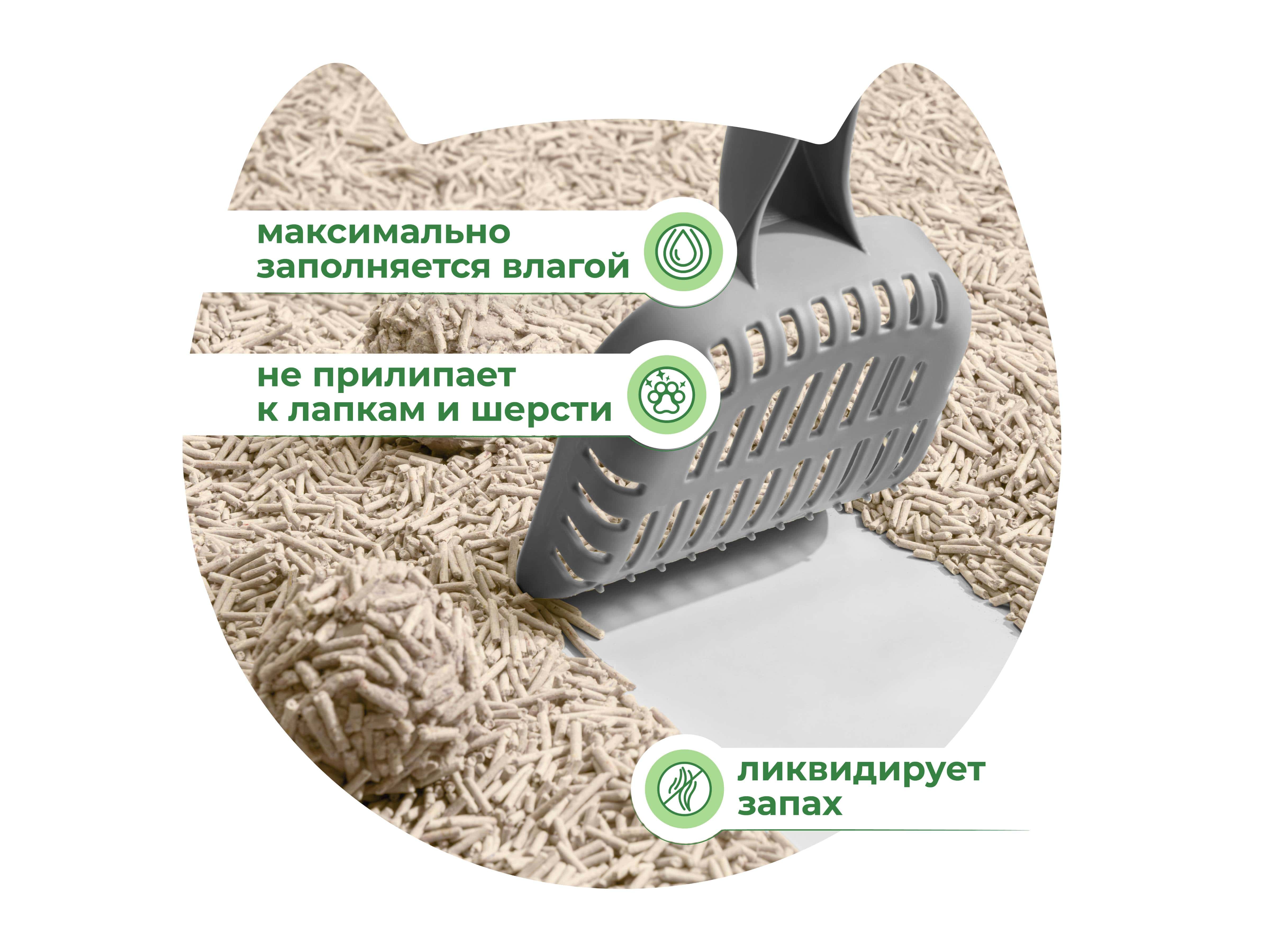 Высокая абсорбирующая способность гранул позволяет надежно блокировать неприятные запахи и сохранять лоток чистым, а компоненты натурального происхождения делают его безопасным для кошек и людей.