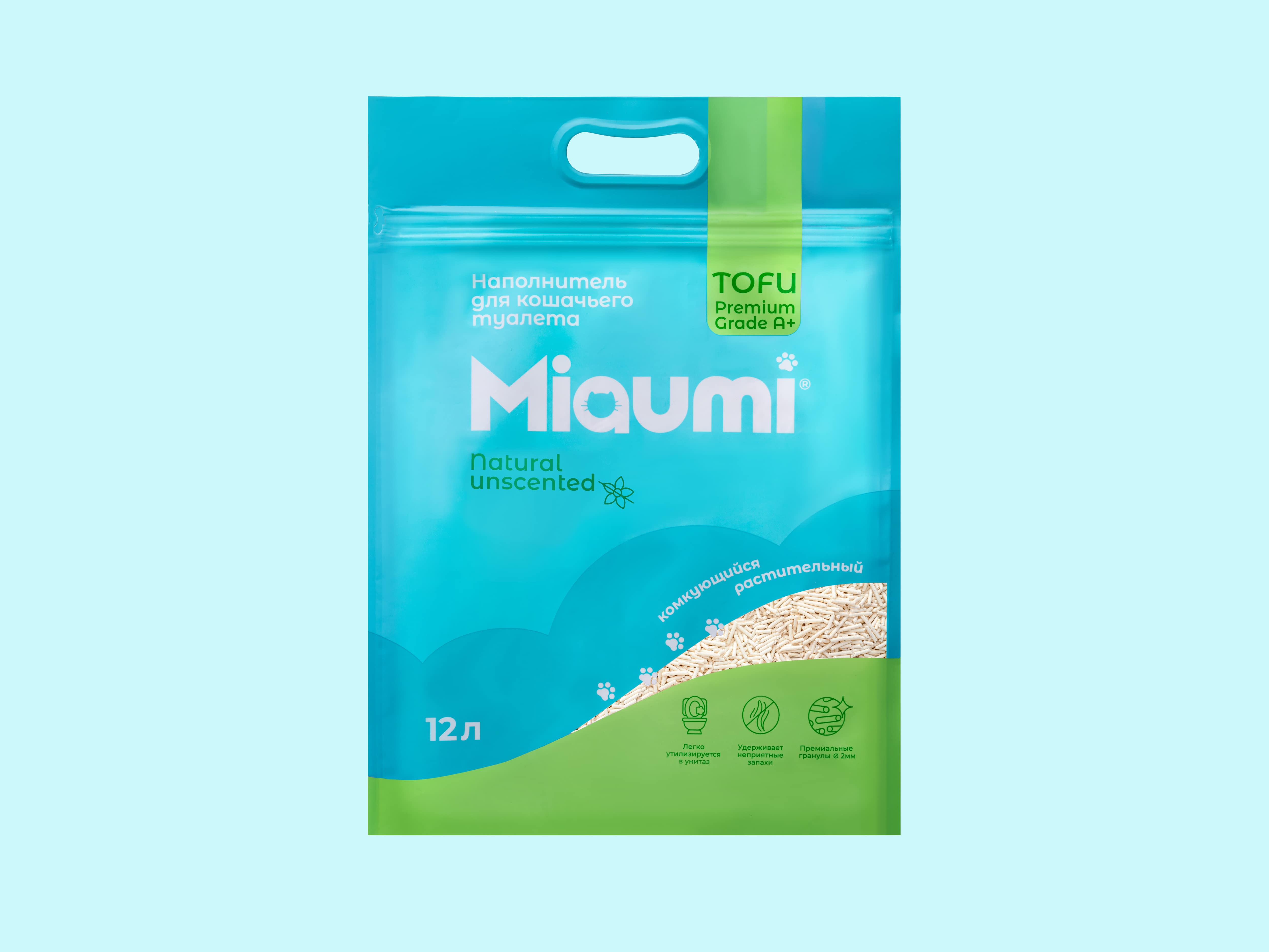 Особенностью наполнителя Miaumi® TOFU Natural Unscented являются премиальные гранулы диаметром 2 мм, обладающие способностью образовывать сверхпрочные комки при соприкосновении с жидкостью, которые впоследствии легко утилизируются в унитаз.