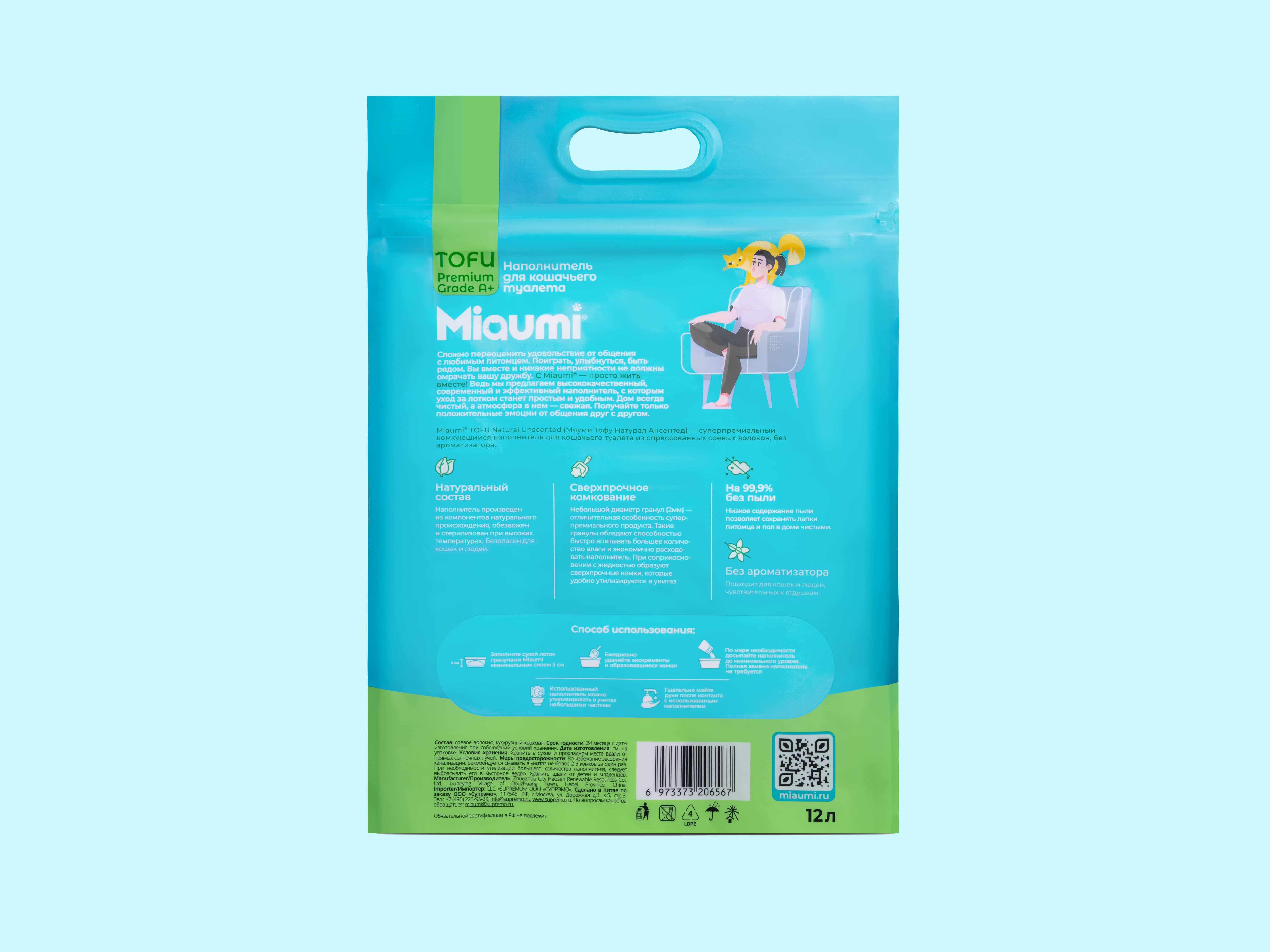 С Miaumi® TOFU Natural Unscented будет легко поддерживать чистоту и уют в доме, ведь наполнитель обеспылен на 99,9%, что позволит сохранять лапки питомца чистыми, как и пол в доме.